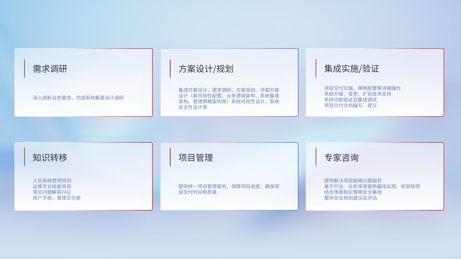 针对客户行业特性,,,,将宏观的安全战略和需求,,,,通过专业的交付服务,,实现项目落地,,为客户提供标准规范的集成交付服务。。。